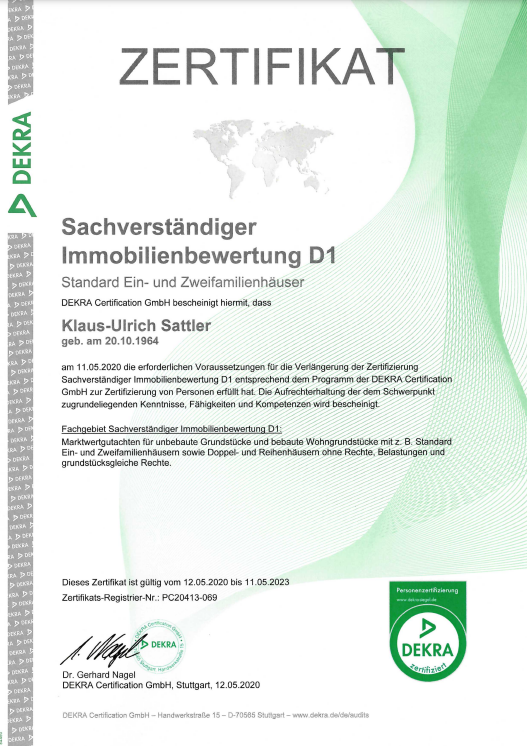 Sachverständiger für Immobilienbewertung D1 (re-zertifiziert bis Mai 2023) der DEKRA Certification GmbH seit 05/2014